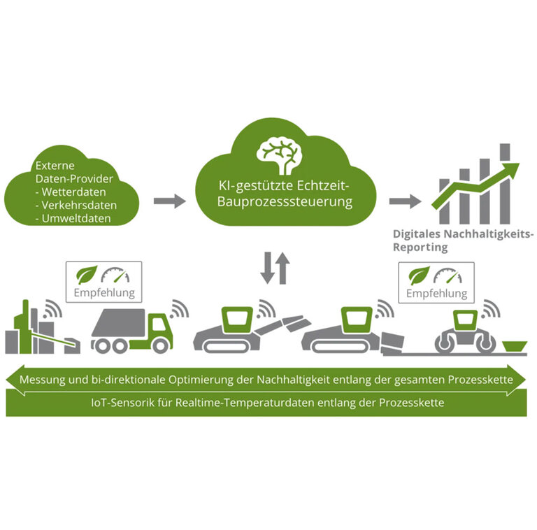 KInaStra steht für „Künstliche Intelligenz für den nachhaltigen Straßenbau" und verfolgt das Ziel, den CO₂-Fußabdruck von Asphaltbaustellen in Echtzeit messbar und steuerbar zu machen. Mithilfe modernster Sensorik, Cloud-Technologien und KI-gestützter Analysen werden Bauprozesse intelligent optimiert – ohne Kompromisse bei Qualität, Zeit oder Kosten.